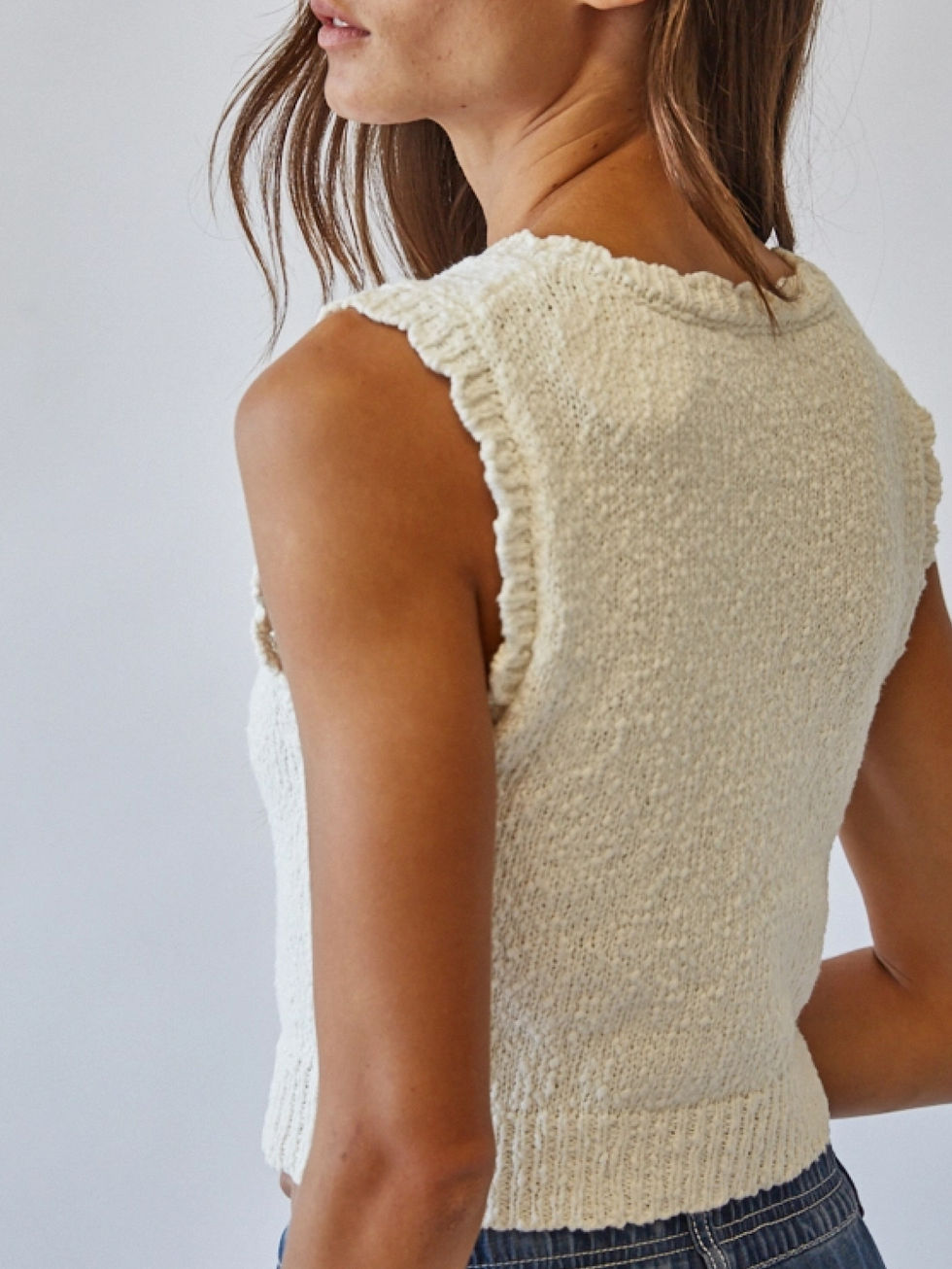 The Button Down Knit Vest is a cozy and sophisticated layering essential designed for the woman who appreciates vintage-inspired details and effortless style. Crafted from soft cotton knitted fabric, this women's knit vest features a delicate textured pattern and feminine ruffled edges along the neckline, armholes, and button placket. The slightly cropped length pairs beautifully with high-waisted bottoms, creating a flattering silhouette that honors modest sensibilities. Whether you're styling it over christian t shirts for women or wearing it as a standalone piece, this button knit vest transitions seamlessly from Sunday services to casual weekday outings.