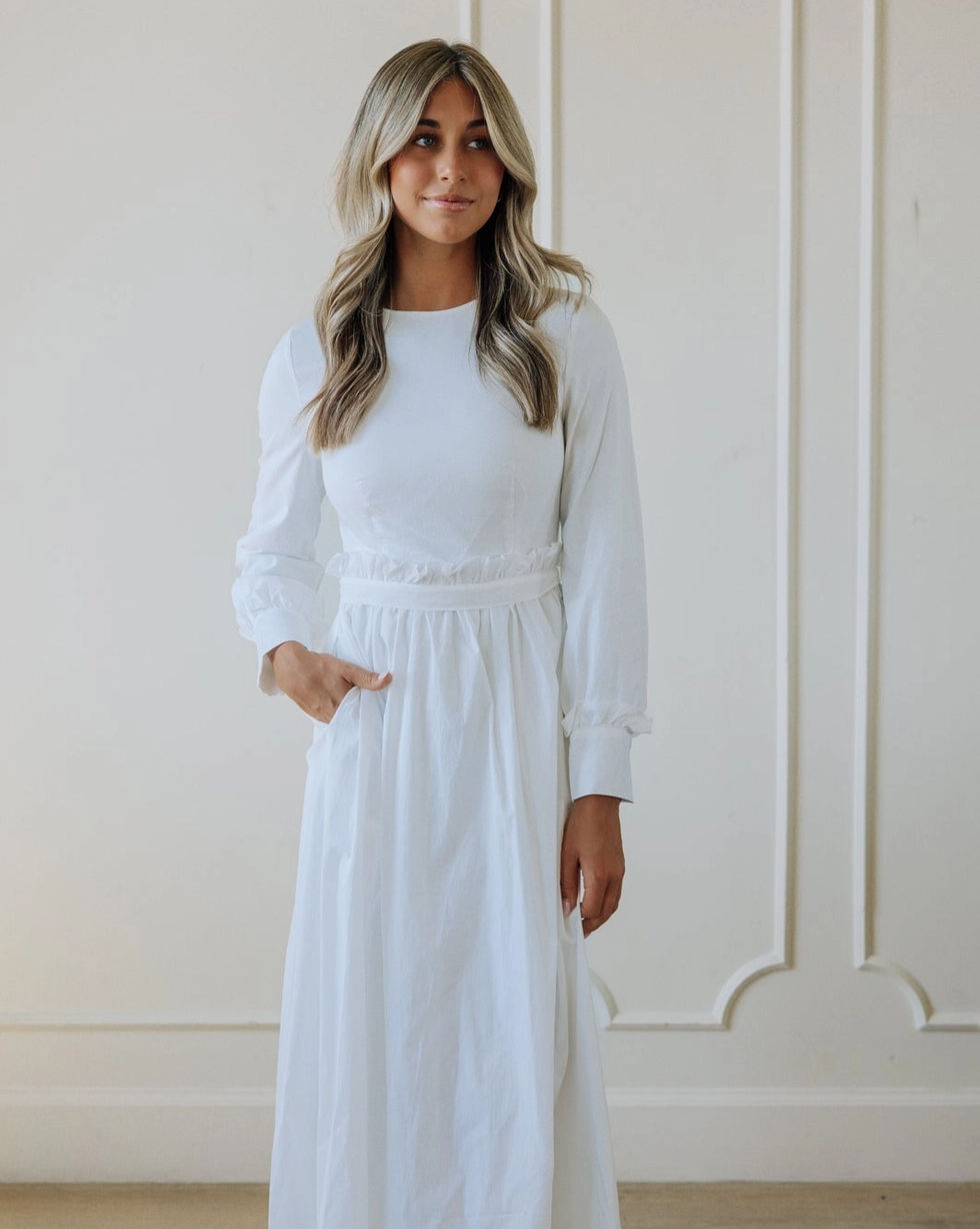 The St. George | Classic Ruffle Waist LDS Temple Dress in Cotton Blend